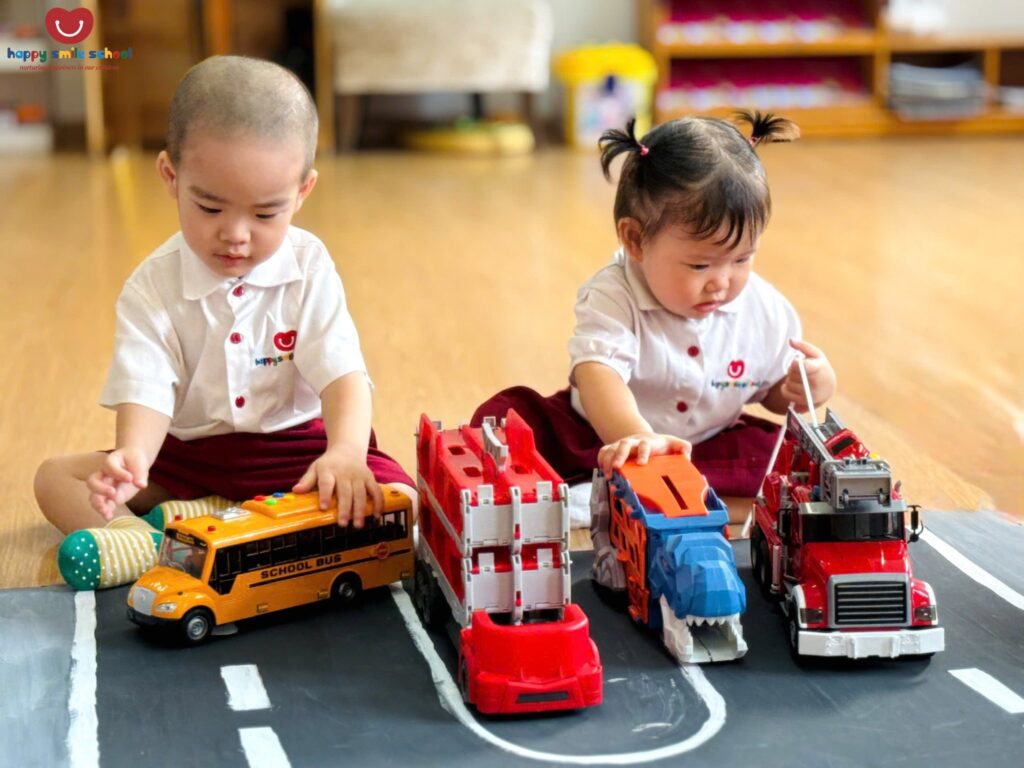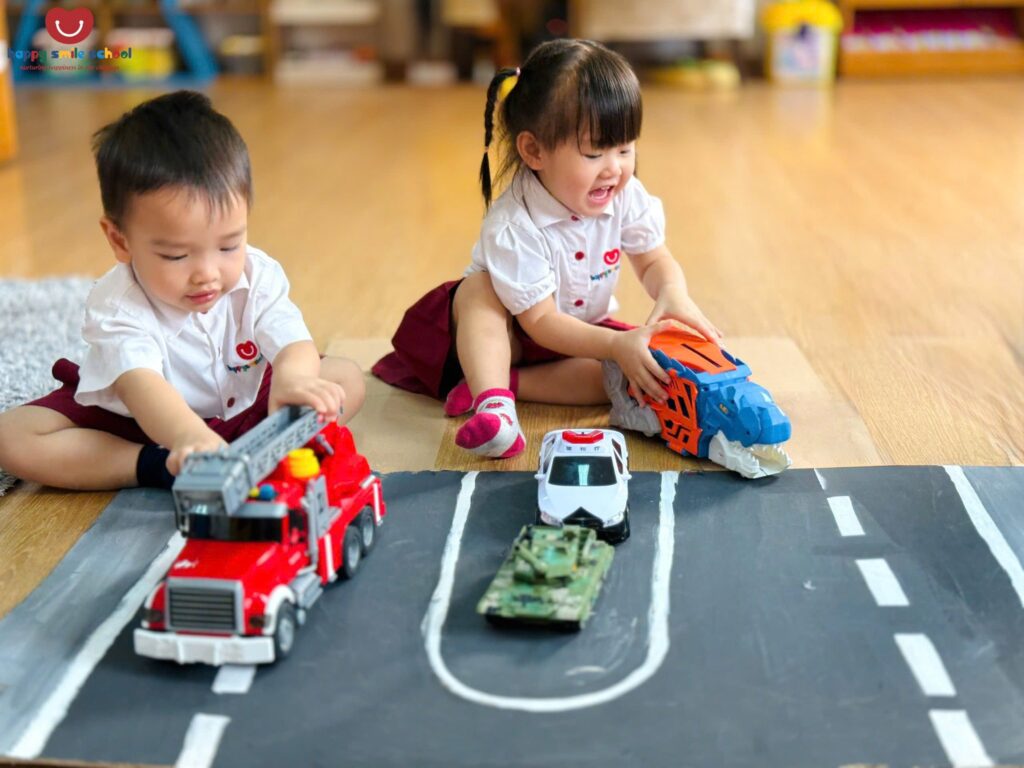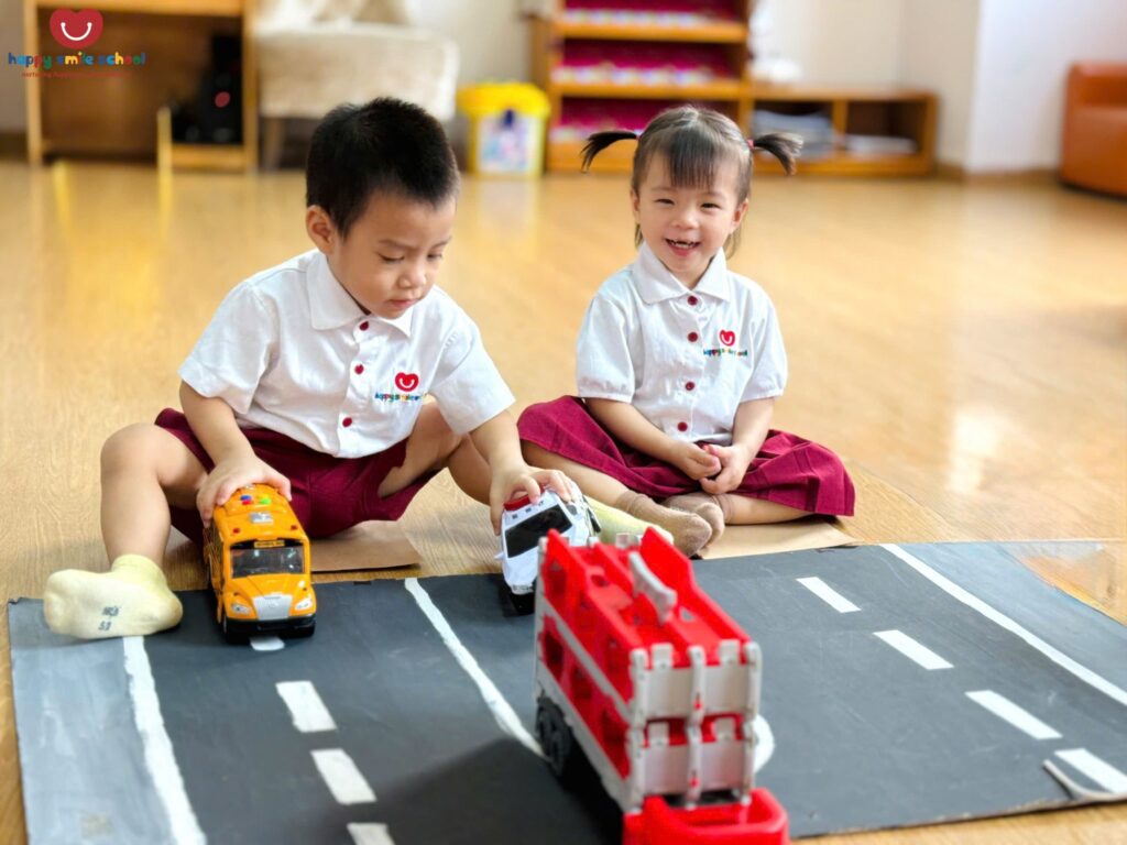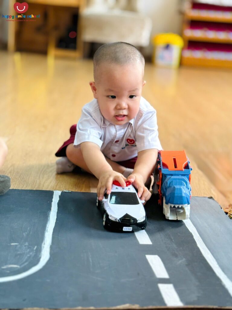 Trong hoạt động Push and Pull Brown Path, các bé 2 tuổi được khuyến khích vận động cơ thể để di chuyển thông qua những trải nghiệm đẩy – kéo sinh động trên con đường màu nâu quen thuộc ![]()